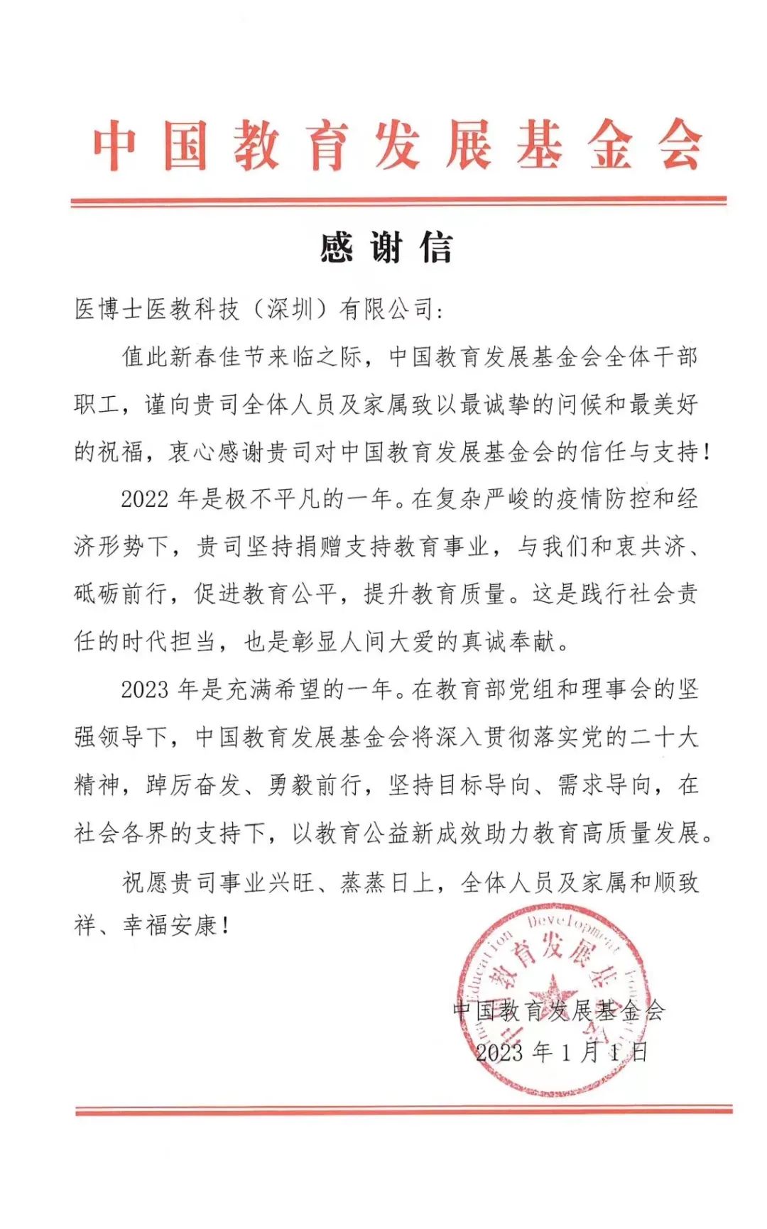 一封來自中國教育發(fā)展基金會的感謝信,醫(yī)博士2022年前行的見證